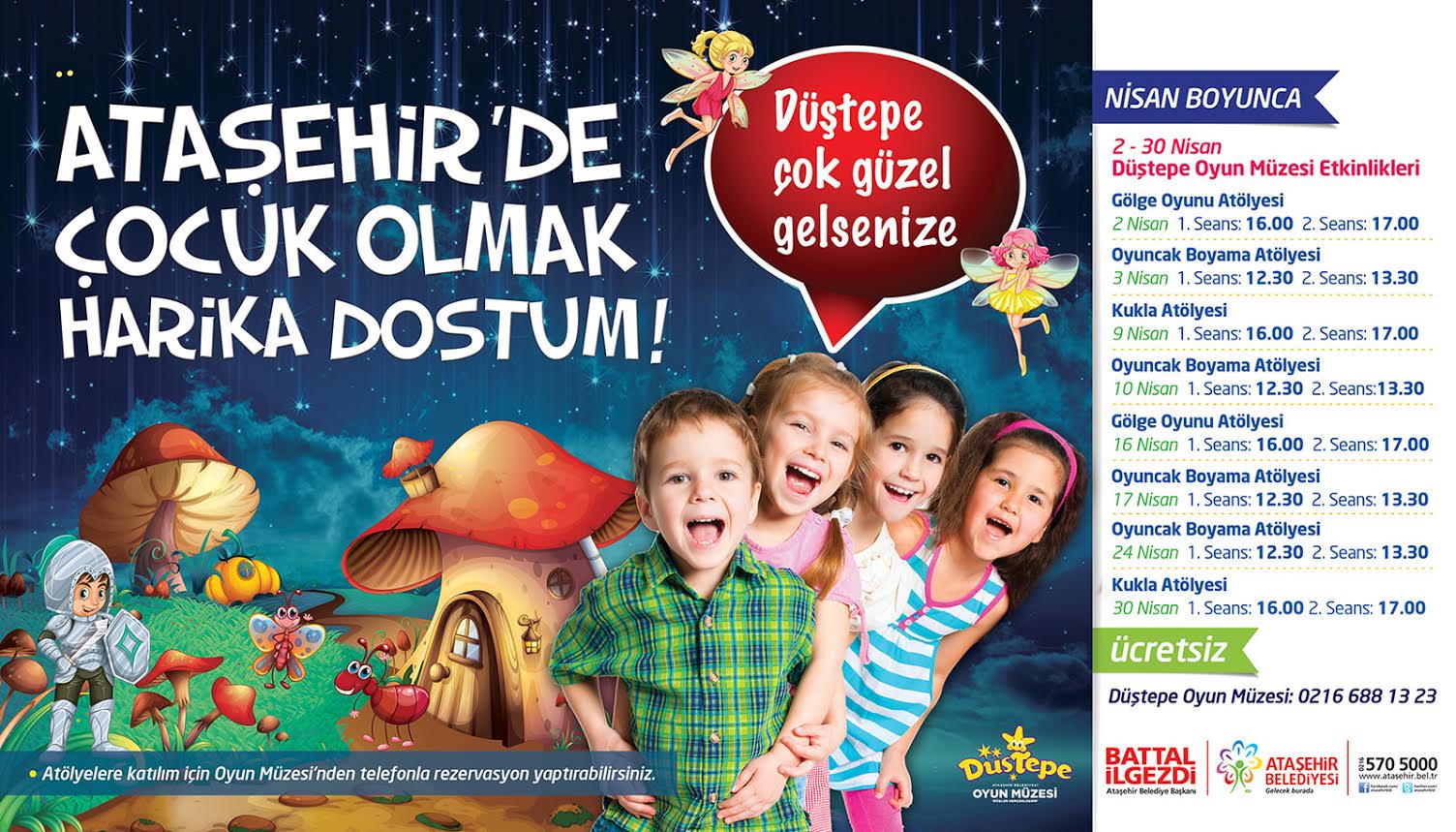 Ataşehir Belediyesi tarafından hazırlanan 23 Nisan eğlenceleri kapsamında; Düştepe Oyun Müzesi“nde çeşitli atölyeler düzenlenirken hem Çocuk Tiyatroları Günleri devam edecek hem de Sokak Tiyatrosu gösterimleri yapılacak.