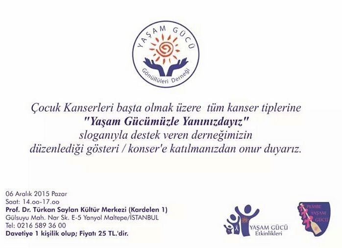 Dernek tarafından kanser sürecini yaşayanlara destek olmak amacı ile Prof. Dr. Türkan Saylan Kültür Merkezi“nde 6 Aralık 2015 tarihinde 14.00-17.00 saatlerinde Bale Resitali, folklor ekipleri, komedyen, Pembe Yaşam Gücü Müzik Grubu ve Gazcı Kardeşler Orkestrası -Vahit Kurt katılımı ile gerçekleşecektir.